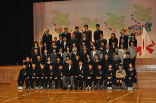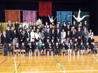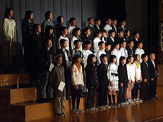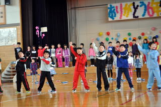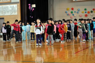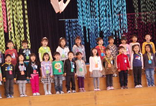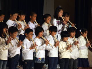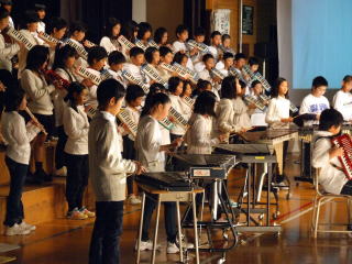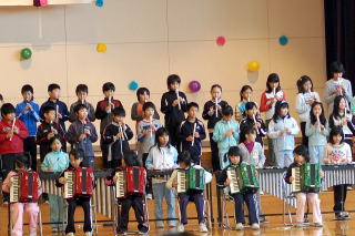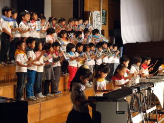 1年生50名が全校児童を代表し挨拶しました。音楽は「やさしく・なかよく・がんばる子」をめあてに勉強や運動を頑張ってきた中で身につけた力や思いをこめて発表しました。「ぼくたちのうた」は歌。「よろこびのうた」は、鍵盤ハーモニカで二部合奏。「ミッキーマウスマーチ」は器楽合奏。鍵盤ハーモニカ,鉄琴,木琴,鈴,カスタネット,タンブリン,小太鼓,大太鼓,シンバル,キーボード,バスキーで演奏しました。 |