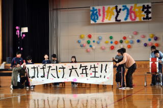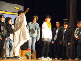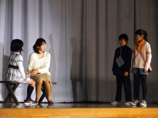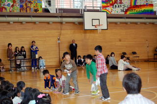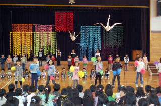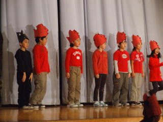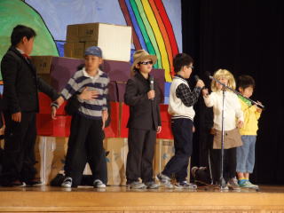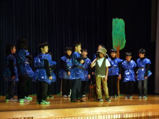 広い広い海の中、魚たちが楽しく暮らしていました。ところがある時,すごいできごとがおき…。魚の他にたくさんの海の仲間たちが,繰り広げる絵本をアレンジして劇にしました。2年生全員で力を合わせて仲良く演じました。劇中では,「パワフルパワー」,ラストは「世界中のこどもたちが」を元気いっぱいに歌いました。 |