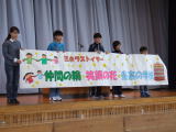 4月の全校朝会A 「書記局から今年度の児童会テーマが発表されました」 『三小ラストイヤー 仲間の輪 笑顔の花 最高の学校』 |