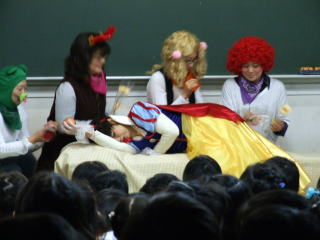 普通の白雪姫とはストーリーが異なり、王子様のキスで白雪姫を目覚めさせることはできません。多くの先生もチャレンジしますが白雪姫は目覚めません。白雪姫が校長先生の元気な挨拶で目覚めるオチに子どもたちは大笑い!!大好評の劇でした!!