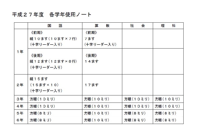 平成27年度の学年ごと使用ノート一覧です。新しいノートを購入されるときはご確認ください。